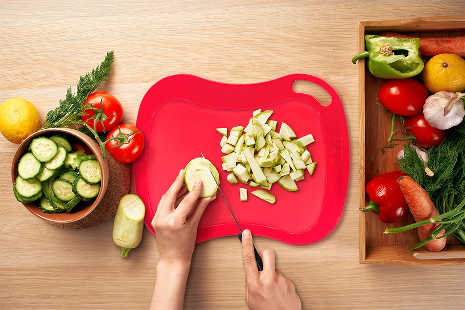 Cuenta con un diseño reversible, lo que ayuda a evitar la mezcla de sabores entre distintos alimentos, manteniendo una preparación más higiénica. Es libre de BPA, segura para el contacto con alimentos y apta para lavavajillas, facilitando su limpieza diaria.